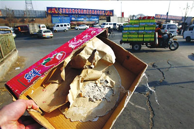 昨天下午,記者見到了這種紙箱。在箱子底部,貼有一張黃色草紙,摸起來凹凸不平。拿刀子割開草紙發(fā)現(xiàn),紙箱底部沾著一層“膩子餅”,直徑約一尺,厚約3毫米,尚未完全干透。記者從市場內(nèi)找了一臺電子秤測量,這個特殊的箱子質(zhì)量有2斤1兩,而與之相同的一般紙箱不到一斤。