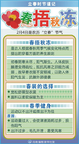 專家提醒說(shuō),立春時(shí)節(jié)乍暖還寒,公眾著裝要謹(jǐn)記“春捂秋凍”,慎防感冒。專家同時(shí)建議,春季健身時(shí)以不出汗或微出汗為佳。若運(yùn)動(dòng)量過(guò)大,則會(huì)使津液消耗過(guò)多,損傷陽(yáng)氣。另外出汗過(guò)多,易受風(fēng)寒。(吳艷 吳潔瑾 俞立嚴(yán))