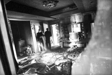 昨日上午9時(shí)30分許,記者在火災(zāi)現(xiàn)場(chǎng)看到,房屋客廳內(nèi)一片狼籍,地板、沙發(fā)、電視機(jī)等都被燒毀,窗戶(hù)被撬開(kāi),墻壁都被熏黑了,門(mén)前有一個(gè)使用過(guò)的滅火器。 民警、消防人員正在勘查現(xiàn)場(chǎng)。