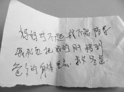 令崔女士怎么也沒有想到的是,1月24日中午12點(diǎn)半左右,當(dāng)她從醫(yī)院回到家,卻發(fā)現(xiàn)自家大門被反鎖了,“我只好從后院翻墻進(jìn)去,看到女兒躺在床上一動(dòng)不動(dòng),就像死了,旁邊有兩個(gè)安眠藥空瓶和一張遺書,上面寫著‘媽媽對(duì)不起,我不能陪你,我死后把我的肝移到爸爸的身體里去,救爸爸!贝夼款D時(shí)覺得天旋地轉(zhuǎn),“這兩瓶安眠藥有200粒。∨畠菏23日傍晚五點(diǎn)多在醫(yī)院吃過晚飯回家的,到我發(fā)現(xiàn)的時(shí)候,有十多個(gè)小時(shí)了!
