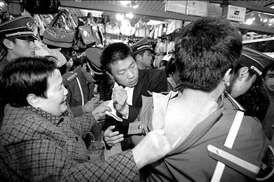 因售假受到封攤處罰,秀水街市場攤主與管理方的矛盾愈演愈烈。15日,秀水街市場對第三批8個被控售假的商戶進(jìn)行封攤處理。其間,封攤?cè)藛T遇到了攤主及其“親友團(tuán)”的殊死抵抗;一老太太還在地上打滾,堅(jiān)決不讓保安靠近自己兒子的攤位。