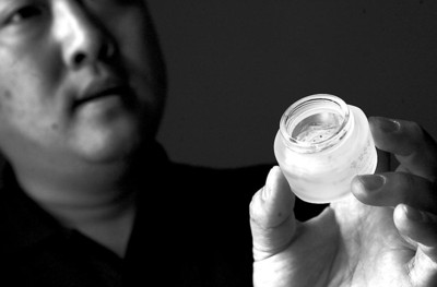 在張四林暫住的旅店里,記者看到他帶來的幾件樣品,都是膏、霜類產(chǎn)品。產(chǎn)品的包裝很精美,保質(zhì)期均到2010年,都沒有拆過封,但是玻璃瓶里的東西都少了幾乎一半。記者打開其中一瓶 “防皺眼喱”,這霜狀的化妝品摸上去已經(jīng)發(fā)硬,挖一點(diǎn)下來涂在手背上,竟搓出一絲一絲的白色物體,根本不能融開。另外一瓶“嫩膚霜”,則幾乎成了塊狀。
