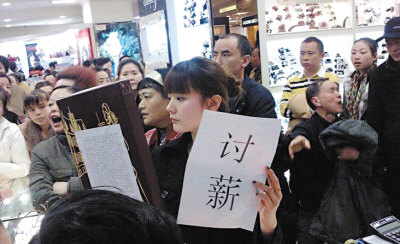 “三八”節(jié)本該是婦女的節(jié)日,然而這一天重慶解放碑鬧市某商場卻出現(xiàn)了一名漂亮女子舉紙條討薪維權(quán)的場面,驚動了110民警。原來,這名討薪女子是廣州一家公司駐該商場的營業(yè)員,因未接待顧客被公司罰款100元,拒交后又遭到調(diào)崗處理。雙方關(guān)系“拉爆”后,遂來到商場追討千余元欠薪。昨天,經(jīng)渝中區(qū)勞動局介入,當(dāng)事雙方已達成協(xié)議,公司方面支付了她3年多的保險金,欠薪也即將支付。