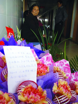 趙蕾的不幸遭遇經(jīng)快報報道后,引起了廣大讀者和蘇州市民的極大關(guān)注。得知趙蕾生日是3月20日和自己同一天,3月14日,一條腿殘疾的82歲老人鐘鑫源特意搖輪椅上街,精心挑選了絲巾和手鏈送到吳江第二醫(yī)院。在病房,送給趙蕾生日禮物后,他還和趙蕾約定,“20日那天,我們一起過生日,一起吹蠟燭,一起吃蛋糕!