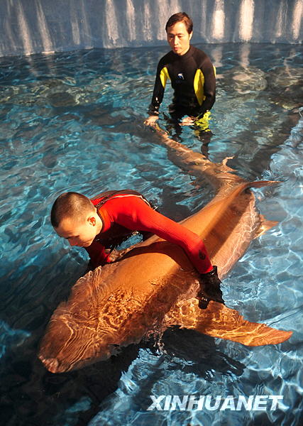 當日晚,廣東省漁政部門從廣州一家酒樓解救出一條護士鯊,并將其送到廣東省水生野生動物救護基地。據(jù)悉,此護士鯊為廣州某酒樓從水產(chǎn)市場購得,在酒樓水族箱里展示,接受食客們的預(yù)定。環(huán)保人士獲知后前往酒樓抗議護鯊,漁政部門隨即前往酒樓將其救出。護士鯊屬于廣東省野生保護動物,受到廣東地方保護法保護。新華社記者 盧漢欣 攝