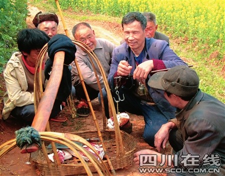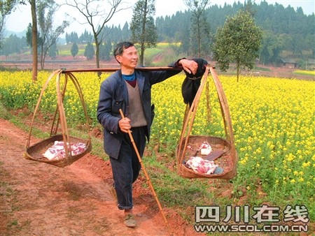 “割肉喲——”上午11點鐘,菜花叢中飛出抑揚頓挫的聲音。循聲追去,見一盲人挑著肉擔,拿著竹竿在鄉(xiāng)間小道上邊摸索前行,邊高聲吆喝!八褪菞钪心# 贝迕裾f。