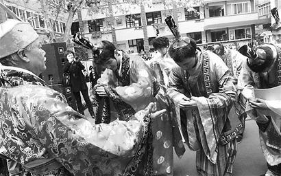 下午2點,幽幽的古樂響起,著漢服的數(shù)位老人和18位青少年再現(xiàn)古時成人禮!罢埿泄诙Y,”在洪亮聲音下,長者們?yōu)榍嗄甏鳌肮凇辈⒄矶苏?8位青年向父母行大禮,感謝養(yǎng)育,再向師長行大禮,感謝教育。據(jù)了解,成人禮自周代就有,當(dāng)時稱為“冠笄之禮”,男孩行“冠禮”,女孩則行“笄禮”。60歲老者羅世明穿著漢服下臺來,他是行禮的長者,“現(xiàn)在年輕人似乎已忘了傳統(tǒng)道德和禮儀,希望他們從國學(xué)文化中重新了解中國傳統(tǒng)文化,端正自己!