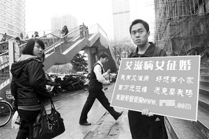 3月28日,武昌中南商業(yè)大樓前,一青年男子手舉一塊廣告牌,聲稱為身家百萬的艾滋病女患者征婚。舉牌的男子自稱姓鐘,在武漢辦了一網(wǎng)站。該“艾滋女”以9.7萬元租下了他網(wǎng)站的首頁,要求專門為她做征婚廣告,還要求他在中南大樓前舉兩天的征婚廣告牌,她每天給網(wǎng)站1000元的報酬。