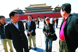 北京市旅游局副局長(zhǎng)于德斌(左2)帶隊(duì)檢查旅游市場(chǎng)時(shí),一名婦女(右2)上前向他自薦黑導(dǎo)游。昨日,北京市旅游局聯(lián)合城管、治安總隊(duì)等到故宮檢查無(wú)證導(dǎo)游帶團(tuán)現(xiàn)象。由于都是便裝,執(zhí)法人員還沒(méi)走到太和殿,一名無(wú)證女導(dǎo)游就迎了上來(lái),詢問(wèn)是否需要導(dǎo)游。執(zhí)法員隨后表明身份,要求她到指定地點(diǎn)接受處理。本報(bào)記者 吳江 傅沙沙 攝影報(bào)道