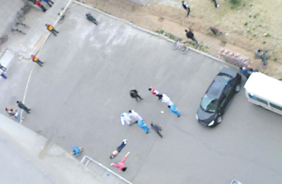 昨天,該校一名現(xiàn)場(chǎng)目擊者陳姓學(xué)生透露,先聽(tīng)到有一男一女的爭(zhēng)吵聲,接著聽(tīng)到一個(gè)女生的嘶喊聲,后來(lái)就看到一女一男先后從公寓樓墜下。當(dāng)天下午6:40左右,北京朝陽(yáng)警方迅速封鎖現(xiàn)場(chǎng),展開(kāi)調(diào)查。另一目擊者說(shuō),當(dāng)晚6:20,一名女生從靜思苑13層?xùn)|南側(cè)樓梯窗口墜下,5分鐘后男生從同一位置墜下。墜樓后,兩人橫躺在宿舍樓南側(cè)的地面上,女生穿粉紅色睡衣,男生光著上身,下身穿牛仔褲,身下有大片血跡。原來(lái),兩人墜樓的窗臺(tái)高約1米,窗戶面積不足1平方米,窗戶的紗窗已被撕開(kāi),一件藍(lán)色運(yùn)動(dòng)上衣還留在窗臺(tái)上,附近地面上還有數(shù)根煙頭,該樓一層?xùn)|側(cè)入口處的欄桿也被砸斷!