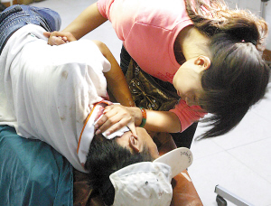 昨日下午3點(diǎn)多鐘,脖子血流不止的周方被救護(hù)車送進(jìn)市急救中心后拒絕進(jìn)入急診室接受治療。記者看到,周方的脖子左側(cè)有一道長約6公分的刀傷,鮮血直流,染紅了白色T恤和頭上的棒球帽。醫(yī)護(hù)人員和匡非好不容易將他勸進(jìn)去,他卻趴在病床上痛哭不已,約10分鐘后,才平靜下來,接受了縫合處理。據(jù)醫(yī)生介紹,周方的傷口淺,未傷及主動脈,無生命危險(xiǎn)。