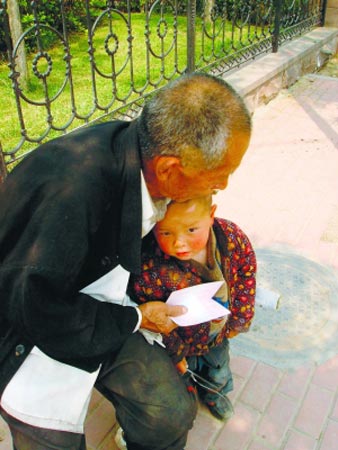 昨日,濟南泉城廣場西南角,坐著一名老漢,身旁一個小男孩在地上爬來爬去。記者正想上去問問,圍觀的一名大娘頭一扭,壓低聲音和同伴說起了啥,記者豎起了耳朵,“這是祖孫倆嗎?不是拐賣小孩的吧,還是裝乞丐騙錢呢……好像是個殘疾人呢……”錯!人家是爺倆,不是祖孫倆!他們來濟南是為了找工作。