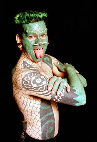 埃里克·斯普拉格,人稱“蜥蜴人”,生于1972年,是“分割舌頭”整容術(shù)的創(chuàng)始人,這種手術(shù)曾一度成為流行趨勢(shì)。為了讓自己看起來更像爬行動(dòng)物,這名37歲的男子已經(jīng)在紋身沙龍里度過了700小時(shí)。除此之外,他還在眉毛上方植入了10個(gè)特氟龍材料的“角”,并讓牙齒變得更加鋒利……