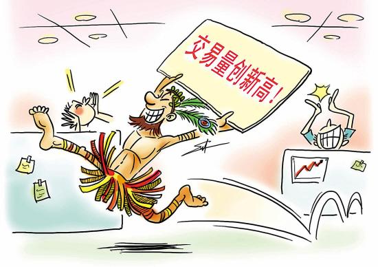 跑到辦公室中間時(shí),這名男子忽然將原本抱在胸前的長(zhǎng)方形紙牌翻轉(zhuǎn)過來,高舉過頭頂,上面用超大號(hào)的紅字寫著“交易量創(chuàng)新高”。