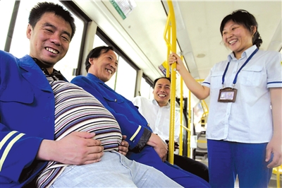 昨天上午,在北京站東街的639公交車總站內(nèi),突然多了很多“孕婦”集中乘車。為迎接母親節(jié)的到來,車隊讓男司乘人員假扮孕婦,體驗當(dāng)母親的辛苦。