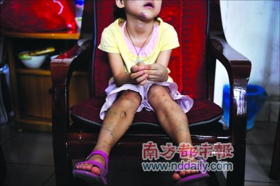 昨日下午3時,在花都區(qū)明日之星幼兒園,大(2)班的班主任巫老師把小怡帶進園長辦公室。小怡裸露在外的臉部、雙手、雙腳,可見幾十處淤青和剛剛結(jié)痂不久的傷口。