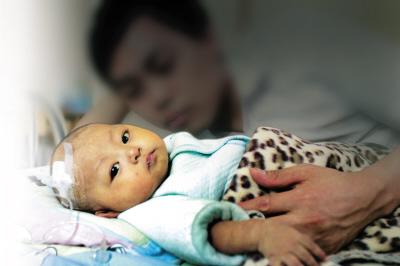 昨日,在兒童醫(yī)院內(nèi)科住院部的病床上,5個月大的周舟頭上插著輸液管,小臉蠟黃。當記者伸過手去,她居然拉著記者的手不肯松開,模樣惹人憐愛。