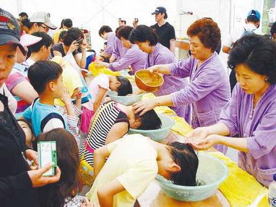 隨后,朋友陪同記者參加慶祝活動,記者看到姑娘們用菖蒲根做成簪子別在頭上,男人們則將菖蒲根纏在腰上。朋友說,這象征可以防止頭痛和災(zāi)厄的發(fā)生。慶祝活動中有很多儀式,孩子用菖蒲水洗頭發(fā),祈求健康;人們點燃許愿燈,祝愿家人平安。來自農(nóng)村的民俗表演是整個活動中最熱鬧的。小伙子舞動繪有龍圖案和寫有“農(nóng)者天下之大樂”等字樣的大旗,身穿韓服的人們邊敲鼓邊圍成圈跳舞,一些人則裝扮成小丑,穿插在隊伍里,場面很熱鬧,他們用這種形式表達豐收的喜悅。朋友說,端午最有代表性的娛樂活動就是女性聚在一起蕩秋千,男人聚在一起摔跤。端午當天,也有將曬干的艾葉放在大門旁邊以除災(zāi)驅(qū)邪的習(xí)俗,韓國人喝菖蒲酒,還將扇子作為禮物贈送,不少商家趁此機會熱賣扇子。