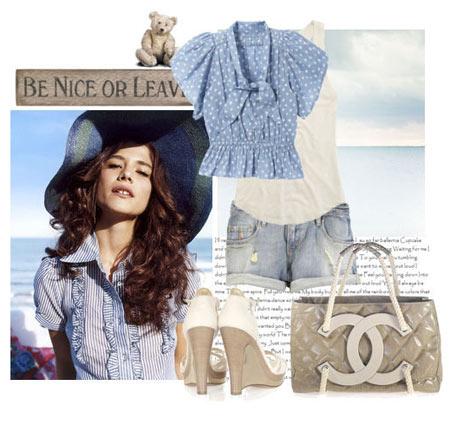 清爽的裝扮讓人感受到大海的清新自然,磨舊牛仔短褲和白色背心清爽穿搭,搭配甜美可愛的圓點襯衫,十足的海邊可人兒。