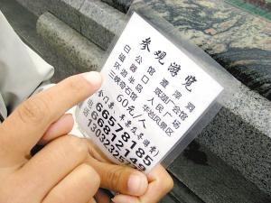 “一日游,60塊錢(qián)。馬上就可以走。”一名婦女湊上來(lái),還揚(yáng)起手中的一張紙片,上面印有參觀行程:白公館、渣滓洞、磁器口或湖廣會(huì)館、環(huán)游半島、人民廣場(chǎng)、三峽奇石館、華巖風(fēng)景區(qū)(含門(mén)票、車(chē)費(fèi)、導(dǎo)游費(fèi))。