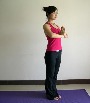 1.雙臂移到胸前,兩個(gè)手掌合攏。