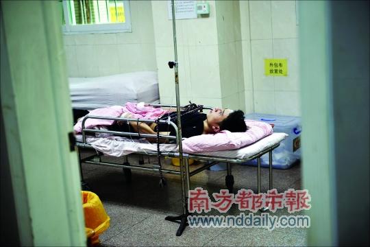 在番禺市橋醫(yī)院急診室內(nèi),撞車男子躺在病床上接受治療,為了保證安全,警察用繩索將其身體固定起來(lái)。男子情緒已趨于穩(wěn)定,只是因?yàn)橹暗淖矒,頭部有明顯傷口。