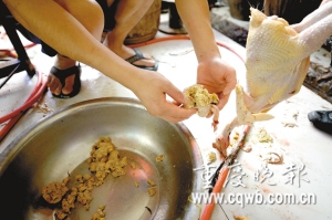 這種雞來自貴州,雞販子把石粉攪成糊狀加點(diǎn)玉米灌進(jìn)雞胃