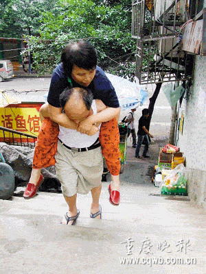 沒有其他生活來源,樓下臨街的煙攤是夫妻倆唯一的生活希望,兩人24小時輪流守候。妻子因病無法行走,殘疾丈夫每天要背她上下樓梯58步。11年來,沙坪壩區(qū)的周靈夫婦風雨無阻地走過了9萬步樓梯。