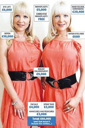 21歲那年,喬決定去做隆鼻手術(shù)。凱莉自然也不甘落后,于是照樣學(xué)樣。凱莉表示:“我們痛恨任何長相上的差異,所以我們不得不一同去做整容手術(shù)!26歲那年,為了“熨平“額頭上的第一道皺紋,姐妹倆雙雙開始定期注射肉毒素。2004年姐妹倆29歲那年,雙雙找到同一位整形醫(yī)生,各花4500英鎊接受了隆胸手術(shù)。有趣的是,由于姐妹倆長得形如“克隆人”,主刀醫(yī)生為了防止“串戶”,手術(shù)前不得不在她們各自的腹部上記上名字。這對孿生姐妹花迄今已經(jīng)共同接受了不下6次美容手術(shù),總耗資超過6萬英鎊。姐妹倆表示,她們無論做什么手術(shù),都將指定同一位醫(yī)生,以便讓她們永遠(yuǎn)“難以分辨”。(宗 文)