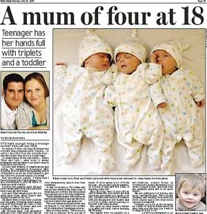 目前,斯安和2歲的兒子加登住在一套政府提供的廉租公寓中,完全靠政府救濟(jì)生活,她每月能領(lǐng)到1126英鎊救濟(jì)金,其中包括房租、兒童福利和家庭稅收貸款。盡管如此,斯安母子二人的生活仍十分拮據(jù)。去年,斯安又結(jié)識了19歲的新男友卡魯姆·托馬斯,盡管斯安和卡魯姆都沒想過要生孩子,但去年10月,當(dāng)時只有17歲的斯安卻再次意外懷上了身孕。更讓斯安做夢也沒想到的是,她懷上的竟是一組三胞胎!