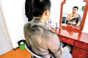 昨天中午,趁著小宋午休,記者約見了他。23歲的小宋,濃眉大眼,俊朗有型。在休息室里,小宋脫掉了紫色上衣,他的前胸立刻露出一大片黑色痕跡,上面還長有毛發(fā),后背幾乎完全被黑色痕跡覆蓋,右臂和頸后毛發(fā)顏色最重。乍一看真的挺像穿著一件黑色毛坎肩。小宋笑笑:“很熱,但都習(xí)慣了。小時(shí)候這胎記很癢,我撓出血了,線衣緊緊粘在身上,揭不下來了,后來用鹽水浸泡才撕下來。”