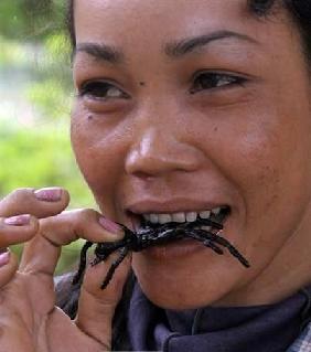 柬埔寨有種獨(dú)特的食物——油炸毒蜘蛛。這種蜘蛛主要產(chǎn)于中部的磅通省,以其肥碩、美味而著名。其他省份也有出產(chǎn),但比磅通的略遜一籌。毒蜘蛛不像我們常見(jiàn)的蜘蛛凌空結(jié)網(wǎng)而居,而是生長(zhǎng)在地下,挖穴棲身,以吃草根果腹,抓它們要掘地三尺。每年4月中旬是毒蜘蛛最多最肥的時(shí)候,捕食蜘蛛當(dāng)以此時(shí)為佳。