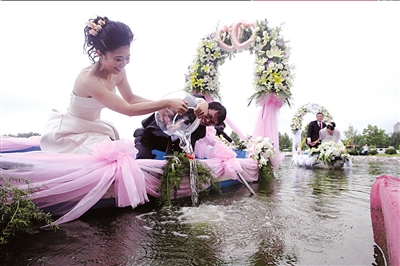 昨天,新人們攜手將象征和平、幸福、美好、富有的金魚倒入池中。當天早上7點多鐘,北京太陽宮公園內(nèi)的水上游園里多了3艘被各式鮮花裝扮得十分漂亮的花船,有三對新人將在這里舉辦京城首場浪漫的“水上集體婚禮”。上午8時,集體婚禮準時開始,在婚禮進行曲及主持人的祝福聲中,新人們踏上“花船”,新娘坐船頭,新郎搖槳,水中“漫游”,新人們船中相互許愿,并攜手將象征和平、幸福、美好、富有的金魚倒入池中……