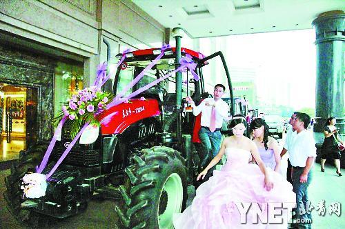 29日下午,由18輛拖拉機(jī)和多輛寶馬、奔馳等組成的浩浩蕩蕩的迎親車隊(duì),由廣東湛江市麻章區(qū)出發(fā)開(kāi)往婚禮舉辦場(chǎng)所——湛江市“皇冠假日酒店”,沿途引來(lái)了大批市民駐足。