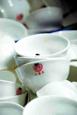 加工車間的門窗開(kāi)著,洗好的碗碟被一股腦兒擠進(jìn)一個(gè)個(gè)粘著一層油漬的箱子里,蒼蠅圍繞著這些碗碟上下紛飛。工作臺(tái)上,四名女工正在給裝進(jìn)塑料袋的碗碟封口。當(dāng)執(zhí)法人員搬開(kāi)一臺(tái)塑封機(jī)時(shí),3只蟑螂一下子鉆進(jìn)碗碟堆里。