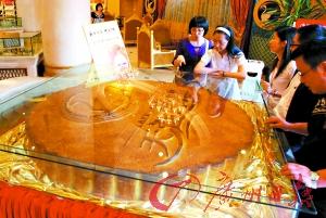 據(jù)介紹,月餅總重為380公斤,直徑160厘米,厚18厘米。為制作此餅,他們專門請(qǐng)了8個(gè)師傅做,僅制作成型就花了16個(gè)小時(shí),然后又烘烤了4個(gè)小時(shí)才完成。僅極品蛋黃就用了30公斤,白蓮蓉用了180公斤,面粉用了150公斤。(記者王鵬、何波攝影報(bào)道)
