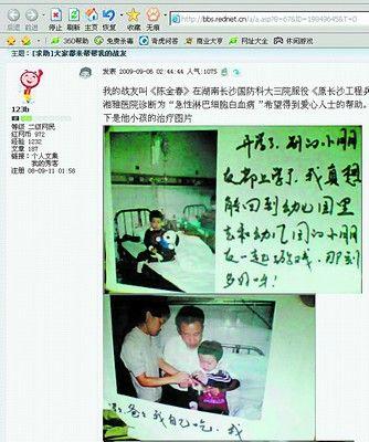 “我的戰(zhàn)友叫陳金春……三級士官轉(zhuǎn)業(yè),現(xiàn)在他的小孩被……診斷為‘急性淋巴細(xì)胞白血病’希望得到愛心人士的幫助!苯衲9月6日,戰(zhàn)友在某網(wǎng)站論壇上為陳金春女兒發(fā)出求助帖。不少網(wǎng)友打電話咨詢情況,并郵寄財物幫助小飛月。