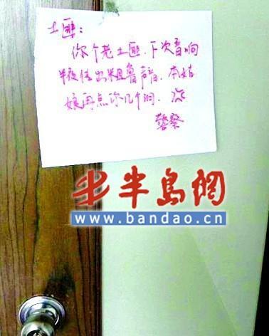 我是特別喜歡玩CS,玩了近5年,咋也不膩,腰不酸,腿也不疼,腦袋還特別好使。國(guó)慶前不久,早上起床收到鄰居“純爺們”貼在俺門上的一張紙條,看到“純爺們”發(fā)飆,趕緊拍下來(lái)留做紀(jì)念。人家在上面寫著:“你個(gè)老土匪,下次音響弄出粗暴聲音,本姑娘再給你在身上點(diǎn)幾個(gè)洞!”
