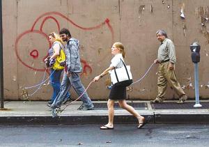 紐約街頭出現(xiàn)一幫人,牽著空狗鏈散步,他們互相逗弄對方的“隱形狗”,甚至撿拾“不存在的便便”。