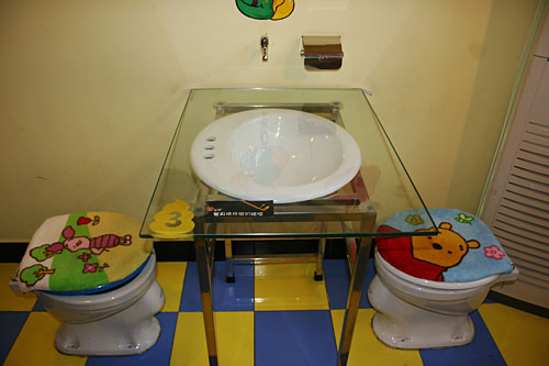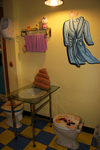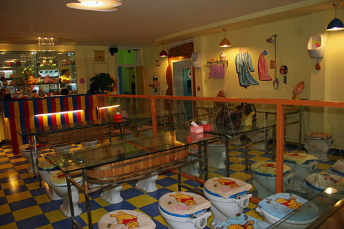 小小的門(mén)面,狹窄的樓梯。走上二樓后,這個(gè)布置得充滿(mǎn)了童趣的餐廳才展現(xiàn)在食客面前。這里的每把座椅都是一座標(biāo)準(zhǔn)的沖水馬桶。盛放主餐的不是盤(pán)子,而是微型馬桶,冷飲則大都放在“蹲坑”形狀的便器里。好在這些餐具造型卡通,并不會(huì)讓人大倒胃口。