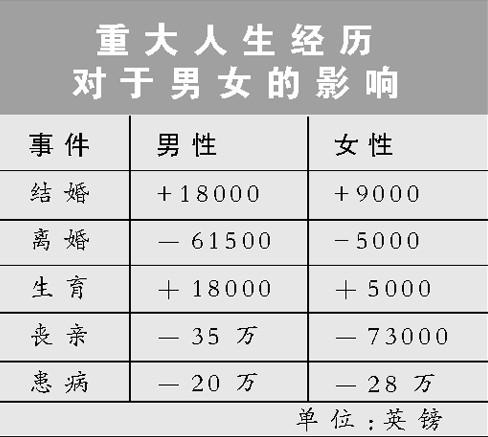 澳大利亞昆士蘭科技大學(xué)教授保羅·弗里吉特斯稱,婚姻、生子、喪親等重大人生經(jīng)歷對于人類幸福和痛苦感的影響可以用金錢來衡量,而在這些重大經(jīng)歷上,男女之間的感受差別都很大。