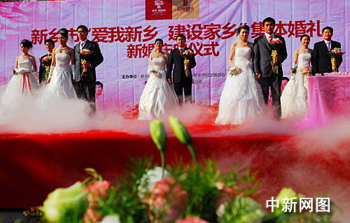 中新網(wǎng)新鄉(xiāng)11月22日 (記者 史寶銀 向明超)11月22日上午,由新鄉(xiāng)市文明辦、共青團(tuán)新鄉(xiāng)市委、新鄉(xiāng)市婦女聯(lián)合共同主辦的“愛我新鄉(xiāng)、建設(shè)家鄉(xiāng)”集體婚禮在新鄉(xiāng)市人民公園東門廣場隆重舉行。慶典儀式上,新郎新娘紛紛捐出了自己的禮金,購買了5000枚石榴花圖案的新鄉(xiāng)市徽向市民免費(fèi)發(fā)放,同時(shí)倡議市民熱愛家鄉(xiāng),建設(shè)家鄉(xiāng)。