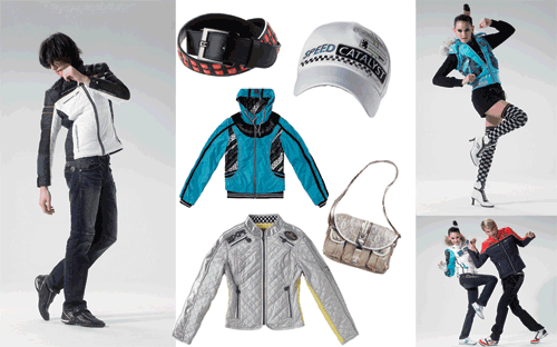 配合著這樣的理念,印滿字母的T恤街頭感十足,一副酷酷的壞壞的樣子讓男生的吸引力上升。外面搭配白色的茄克更顯帥氣清爽,一條做舊的牛仔褲復古感覺強烈,黑白為主色的運動鞋與整體的色系相統(tǒng)一。而女裝有以純黑基本色為主色調(diào),羅紋與真皮相結合,加以局部白色設計點綴,整體服裝風格給人以簡潔干練的感覺。胸前的立體紋案設計,將賽車與休閑完美地結合在一起。白色弧形剪裁分割線,既完美勾勒出女性的優(yōu)美曲線,又凸顯女性自信獨立的氣質(zhì)。