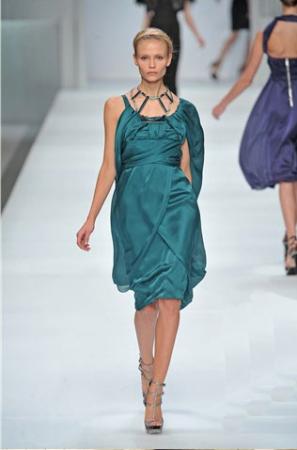 不對稱垂懸式肩袖,在身后形成飄逸的線條,前胸和腰間的圍裹設(shè)計,則是希臘風(fēng)格常見的手法。
