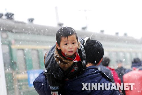 1月23日,一名外來務(wù)工人員扛著孩子在煙臺火車站登車。