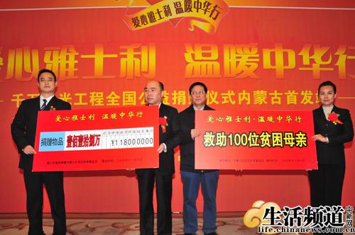 江南綠樹成蔭,塞北已然雪舞。一場(chǎng)面向全國(guó)范圍內(nèi)的“愛心雅士利,溫暖中華行” 千萬陽光工程全國(guó)公益捐贈(zèng)系列活動(dòng)11月10日上午首站內(nèi)蒙古。在呼和浩特市當(dāng)天舉辦的捐助發(fā)放儀式上,國(guó)內(nèi)知名奶粉企業(yè)雅士利集團(tuán)攜手中華慈善國(guó)際互聯(lián)網(wǎng)救助中心、內(nèi)蒙古扶貧基金會(huì),將捐贈(zèng)物資發(fā)放到亟需幫助的兒童福利院與貧困小學(xué)。內(nèi)蒙古自治區(qū)扶貧辦黨組成員副主任馮有恩、黨組成員副主任杜古、黨組成員紀(jì)檢組長(zhǎng)甄小兵及內(nèi)蒙古扶貧辦機(jī)關(guān)各處室及事業(yè)單位的主要領(lǐng)導(dǎo)出席了活動(dòng)。來自新華社內(nèi)蒙古分社、內(nèi)蒙古電視臺(tái)、呼和浩特電視臺(tái)、呼和浩特電臺(tái)、《內(nèi)蒙古日?qǐng)?bào)》、《內(nèi)蒙古晨報(bào)》、《北方新報(bào)》、《北方家庭報(bào)》、《呼和浩特日?qǐng)?bào)》、《乳業(yè)時(shí)報(bào)》、《香港商報(bào)》和《法制與社會(huì)雜志》等媒體記者共同見證捐助發(fā)放儀式。