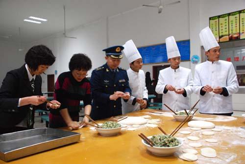 慰問團(tuán)員與戰(zhàn)士一起包餃子