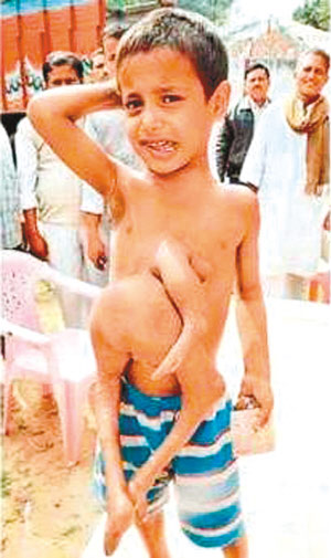 據(jù)德國《圖片報(bào)》2月19日?qǐng)?bào)道,現(xiàn)年8歲的迪帕克·庫馬爾是一名來自印度比哈爾邦的小男孩。從一出生,他的外貌就把周圍的人驚得目瞪口呆:他長著4條腿和3支手臂,在他腹中有個(gè)孿生弟弟和他一起來到這個(gè)世界上。