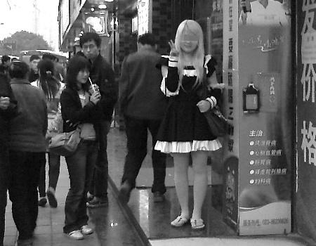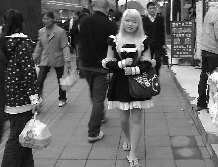 在人潮如織的大街上,一位身穿黑色女仆裝的金發(fā)女孩,正悠然自得地閑逛著——這仿佛日本動(dòng)畫(huà)片中的場(chǎng)景,前日下午,竟在大坪正街上演。原來(lái),這位17歲的女孩,是一位地道的日系“動(dòng)漫族”,有時(shí)候是女巫裝,有時(shí)則是人型電腦裝,幾乎每天她都會(huì)按照日本動(dòng)漫角色的穿著出門(mén)。