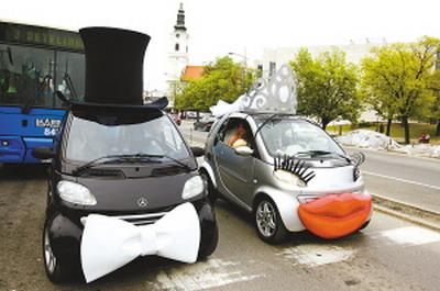 4月24日,塞爾維亞一對新郎和新娘打造另類時尚,開著奇特的“禮帽蝴蝶”婚車前往婚禮現(xiàn)場。